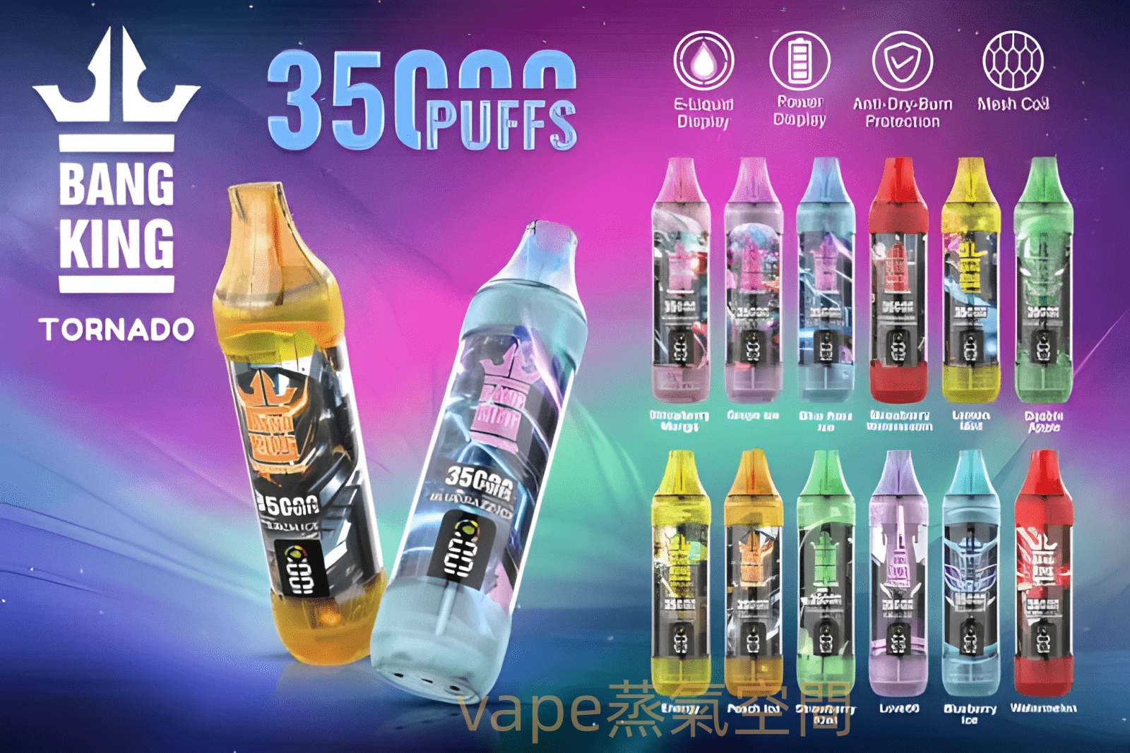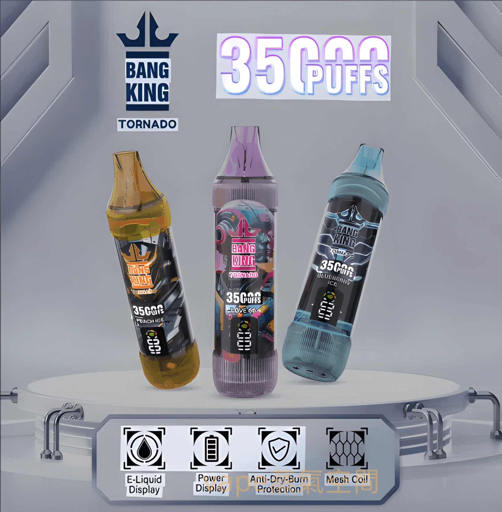 Bang King Tornado 35000 Puffs 以超高吸數與創新技術席捲電子煙市場,結合電子液顯示、電量顯示、乾燒防護、Mesh網芯霧化技術,為玩家帶來極致順滑的霧化體驗。